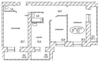 Площадь жилая – 22,7/10,9/18,2 кв.м.,
