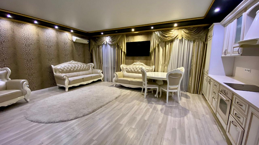 В квартире сделан дизайнерский ремонт в современном стиле «Барокко». Обои и панно в гостиной знаменитого итальянского дизайнера Roberto Cavalli , в спальне обои и панно Валентин Юдашкин , итальянские двери и кухня. Все предметы интерьера подобраны со вкусом. На полу пвх плитка, на стенах обои. Потолки в несколько уровнях. В сан узле кафель. Сан узел совмещенный с окном. Застекленная лоджия с прекрасным видом на набережную реки Амура и Китай. В квартире остается встроенная кухня.