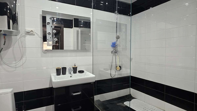 В квартире выполнен хороший ремонт. Стены выровнены и вытянуты, потолки натяжные. Напольное покрытие - ламинат, в коридоре и санузле - керамическая плитка. В прихожей расположена очень просторная гардеробная. Санузел совмещённый, в кафеле, установлен водонагреватель на случаи отключения горячей воды. Очень просторная лоджия, с который открывается потрясающий вид из окна на город и Китай.