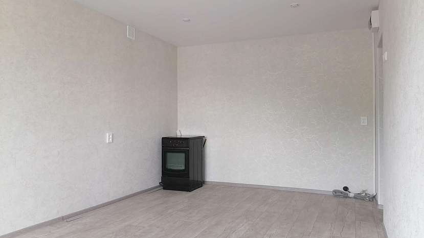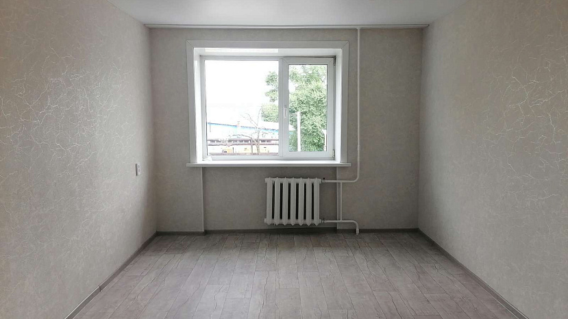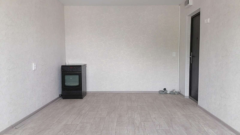 В комнате выполнен свежий эконом ремонт. После ремонта никто не жил. Напольное покрытие - полукоммерческий линолеум, окна - МПО, потолок натяжной. Освещением предусмотрено зонирование комнаты на кухонную и спальную зону.