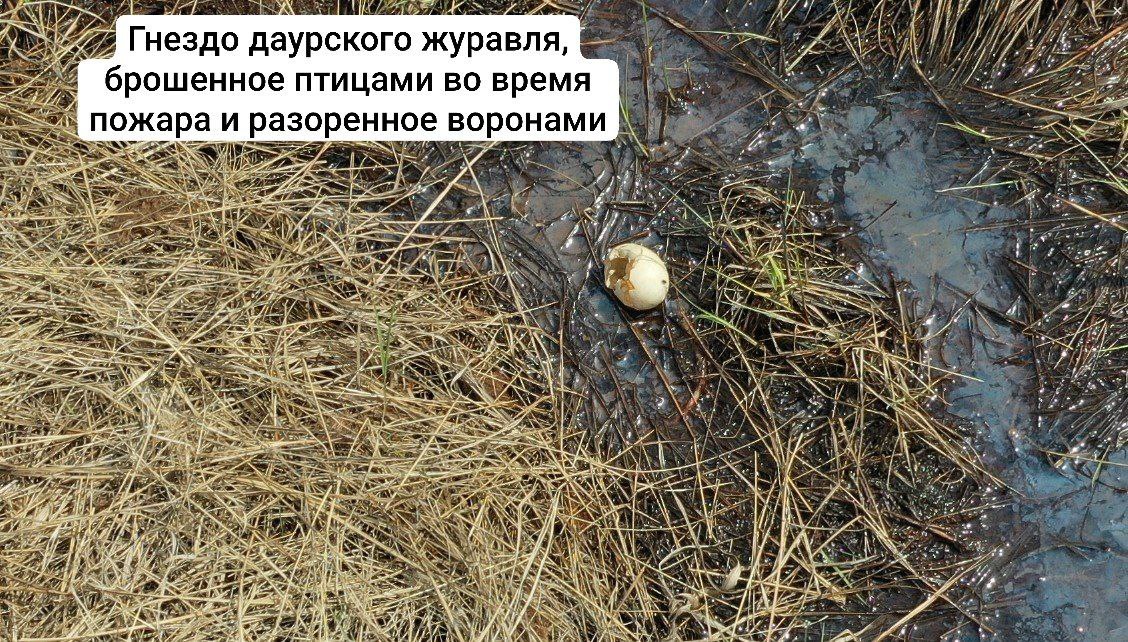 Сгорели три гнезда японских журавлей (всего их 6). В двух были яйца, в третьем птицы готовились к откладке. У даурских журавлей гнезда уцелели, но, пока птицы спасались от огня, некоторые кладки разорили вороны. Были уничтожены несколько гнезд дальневосточного аиста. Там тоже были яйца.