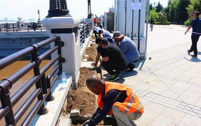 Вчера, 25 июня, около 120 добровольных работников приступили к установке ограждения. Для начала они сняли плитку и зачистили основу от песка. После на неё было установлено ограждение высотой около 1,5 и длиной 1400 метров.