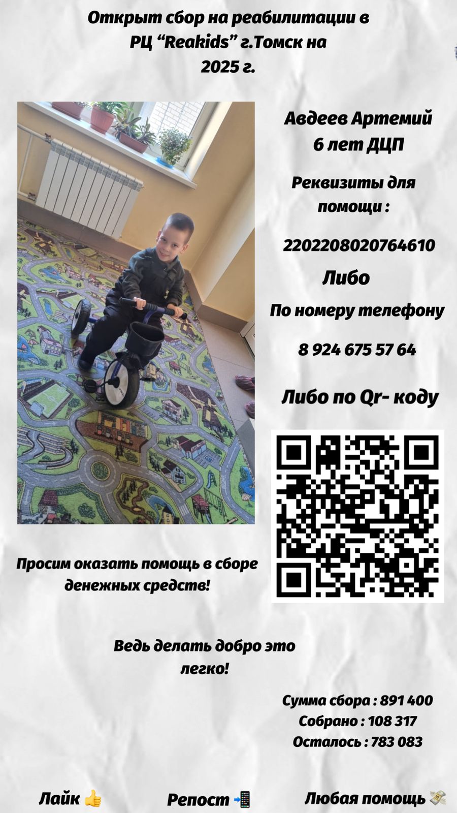 - Мобильный банк 8 924 675 57 64. В сообщение указать «На лечение Артемия»
